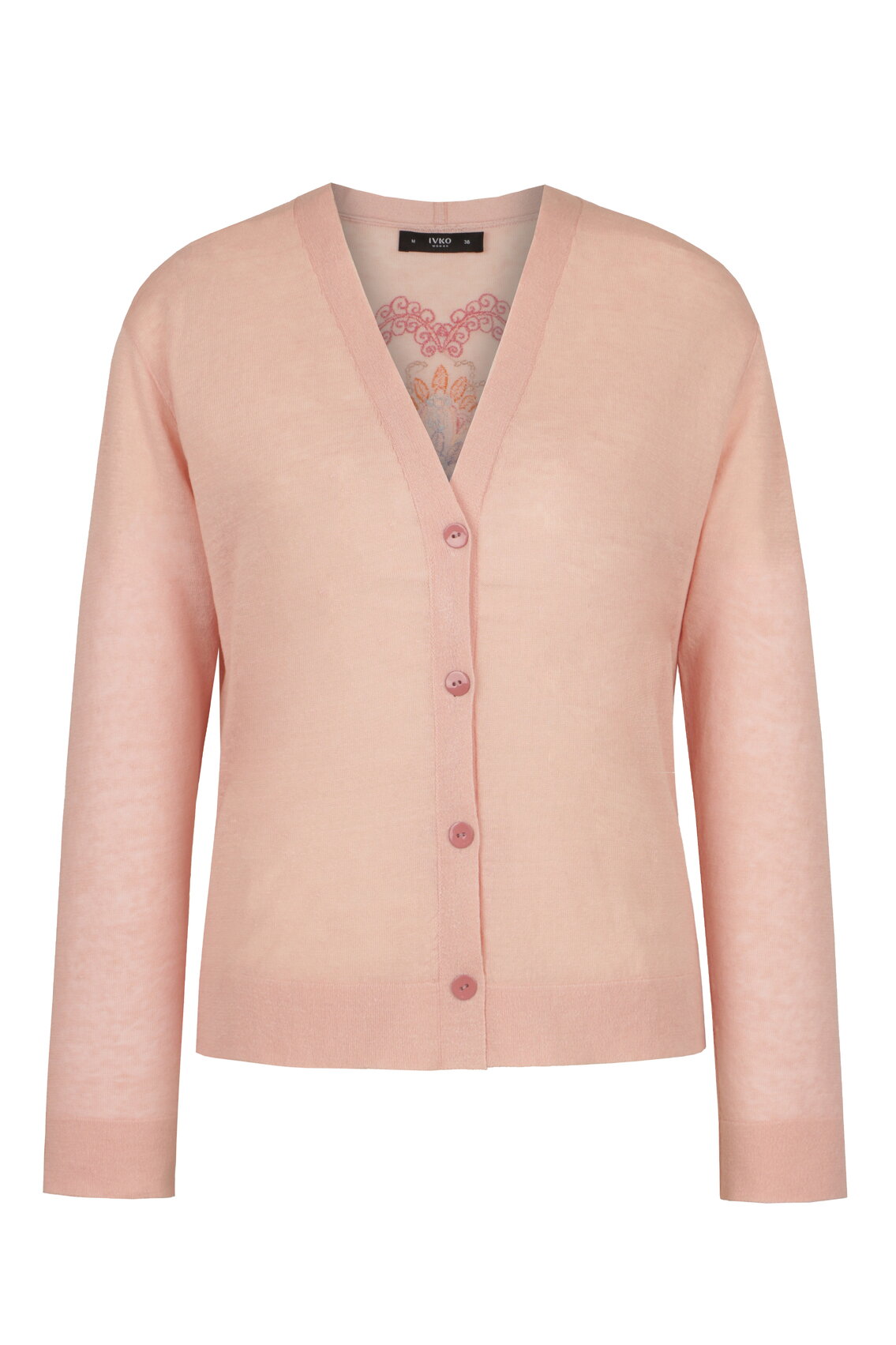 A buttoned cardigan knitted from a linen blend by IVKO Woman, with a central embroidered ornament motif. Mosaic and ceramic-inspired embroidery adds artisanal depth. Linen provides cool, breathable wear that softens over time.