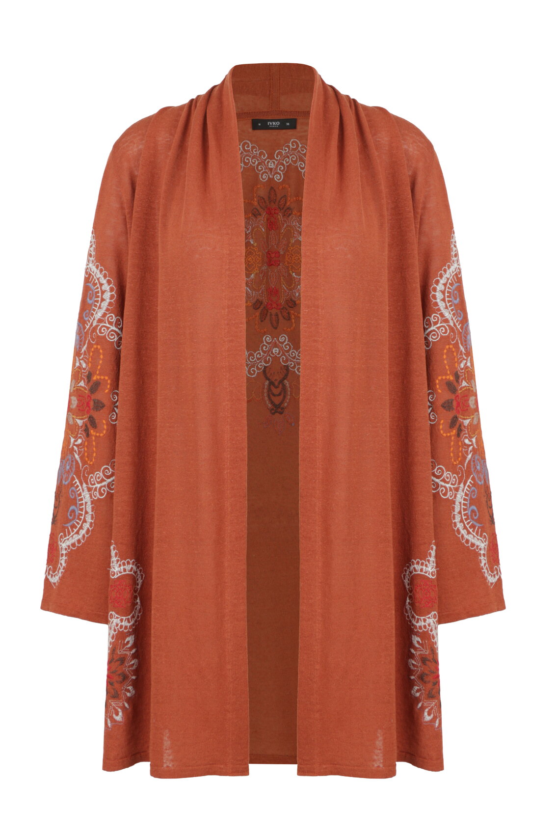 A flowing long cardigan knitted from a linen blend by IVKO Woman, with embroidered ornament detailing. Natural linen texture meets artisanal embroidery rooted in ceramic and mosaic traditions. Exceptionally breathable.