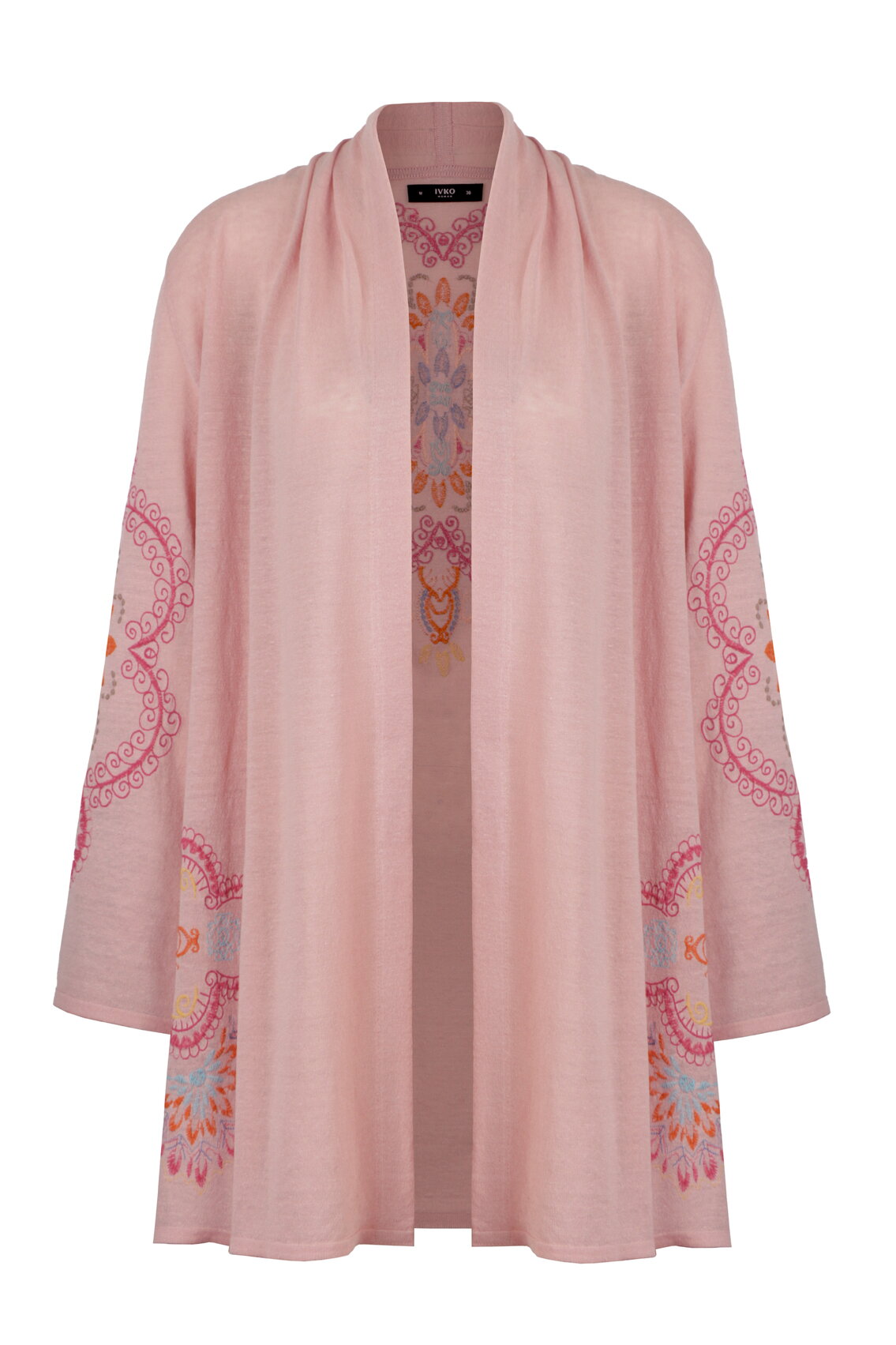 A flowing long cardigan knitted from a linen blend by IVKO Woman, with embroidered ornament detailing. Natural linen texture meets artisanal embroidery rooted in ceramic and mosaic traditions. Exceptionally breathable.