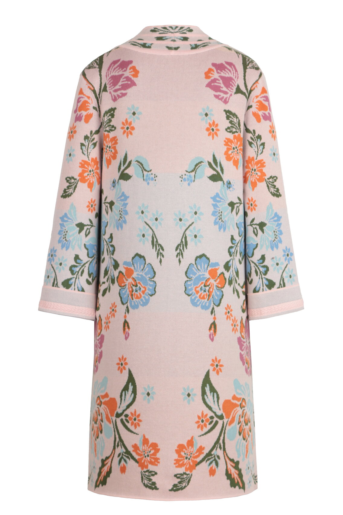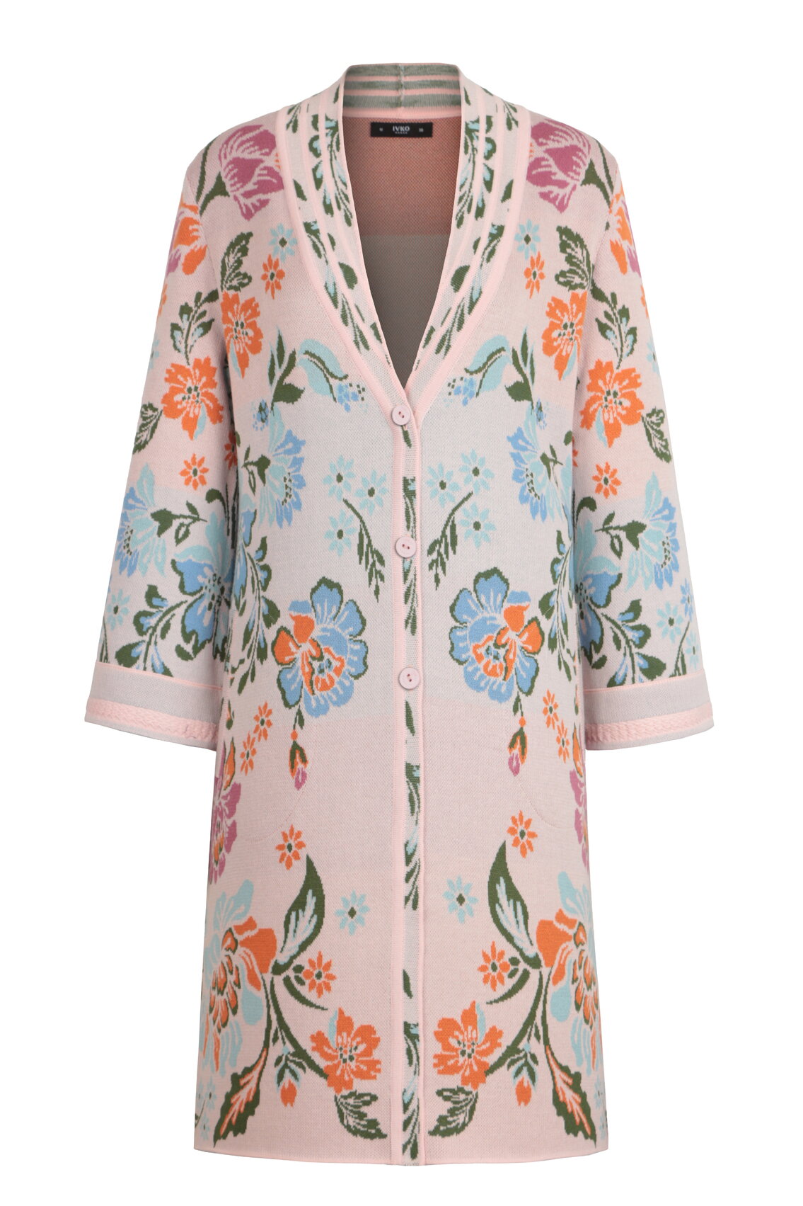 A flowing jacquard coatigan knitted from a cotton-viscose blend by IVKO Woman, with a vibrant all-over floral pattern. The viscose adds a soft, fluid drape that moves beautifully with the body.