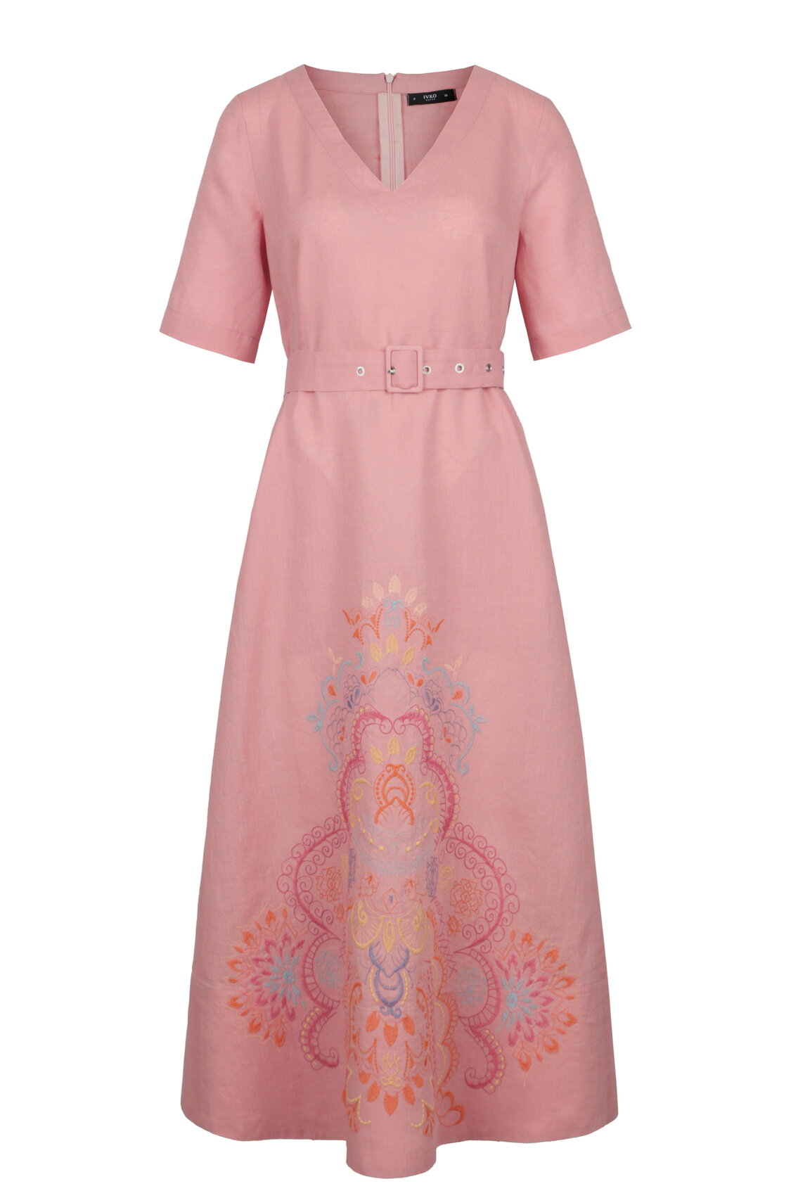 A belted dress in pure linen by IVKO Woman, enriched with elaborate ornamental embroidery inspired by mosaic and ceramic craft. Linen's breathability and temperature regulation make it perfect for warm weather. Quiet sophistication.
