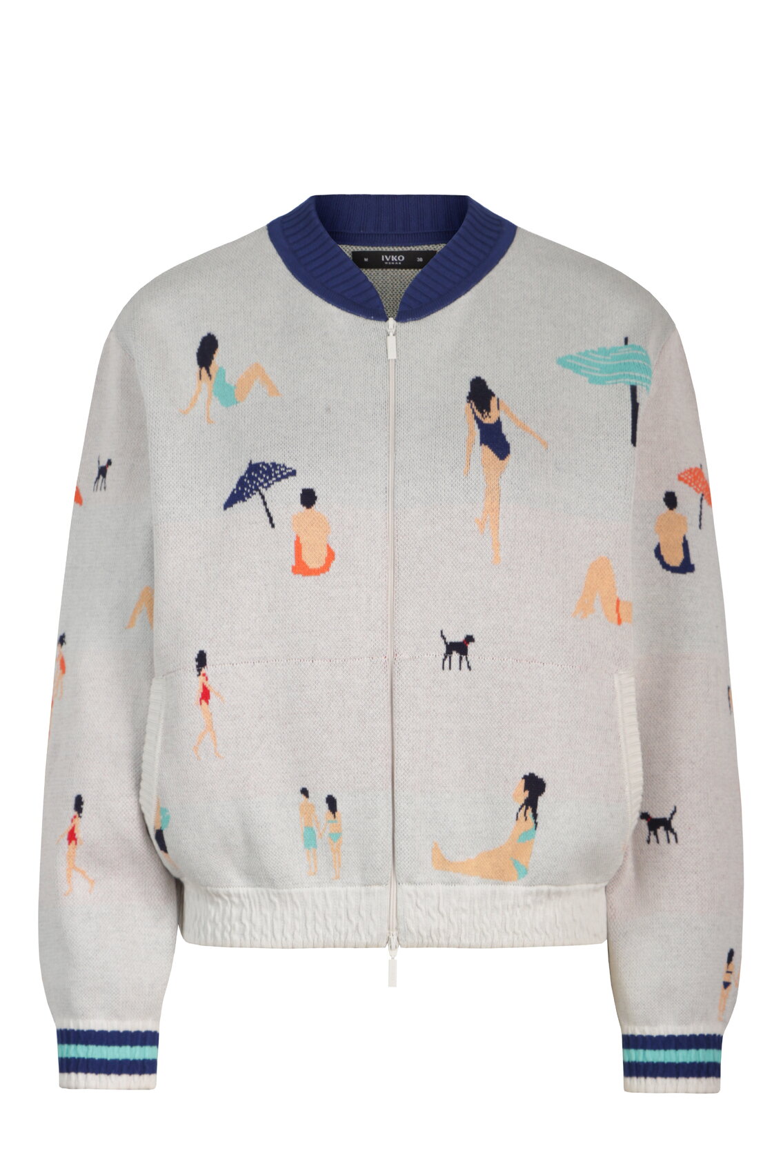 A playful bomber jacket knitted from cotton with elastane by IVKO Woman, featuring charming illustrated beach scenes. Hand-drawn-style motifs channel summertime joy. The touch of elastane adds easy stretch and comfort.