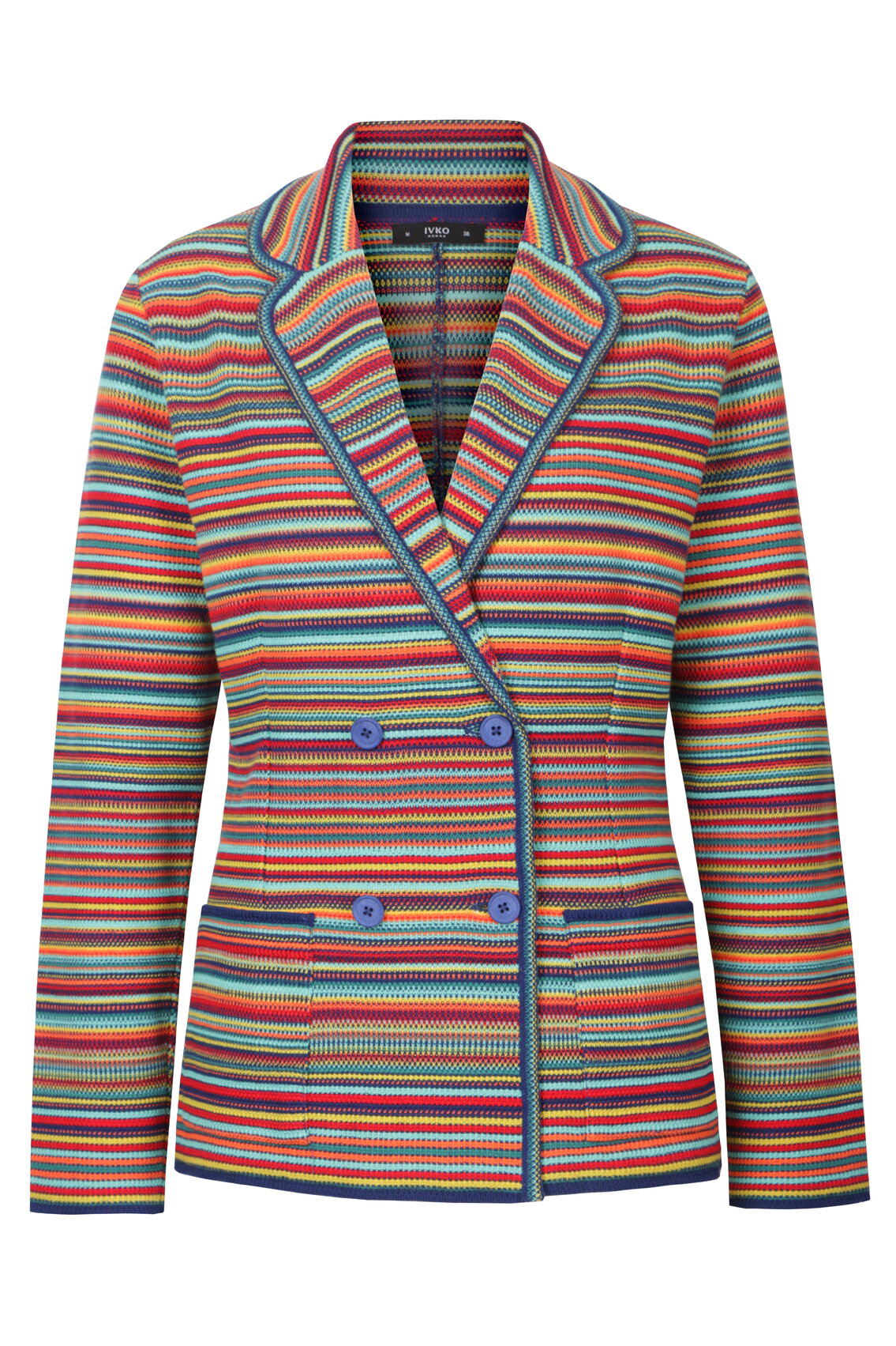 A tailored jacket knitted from pure cotton by IVKO Woman in a sophisticated jacquard stripe pattern. Shifting proportions and tonal variations bring textural depth and modern refinement. Cotton ensures versatile comfort.