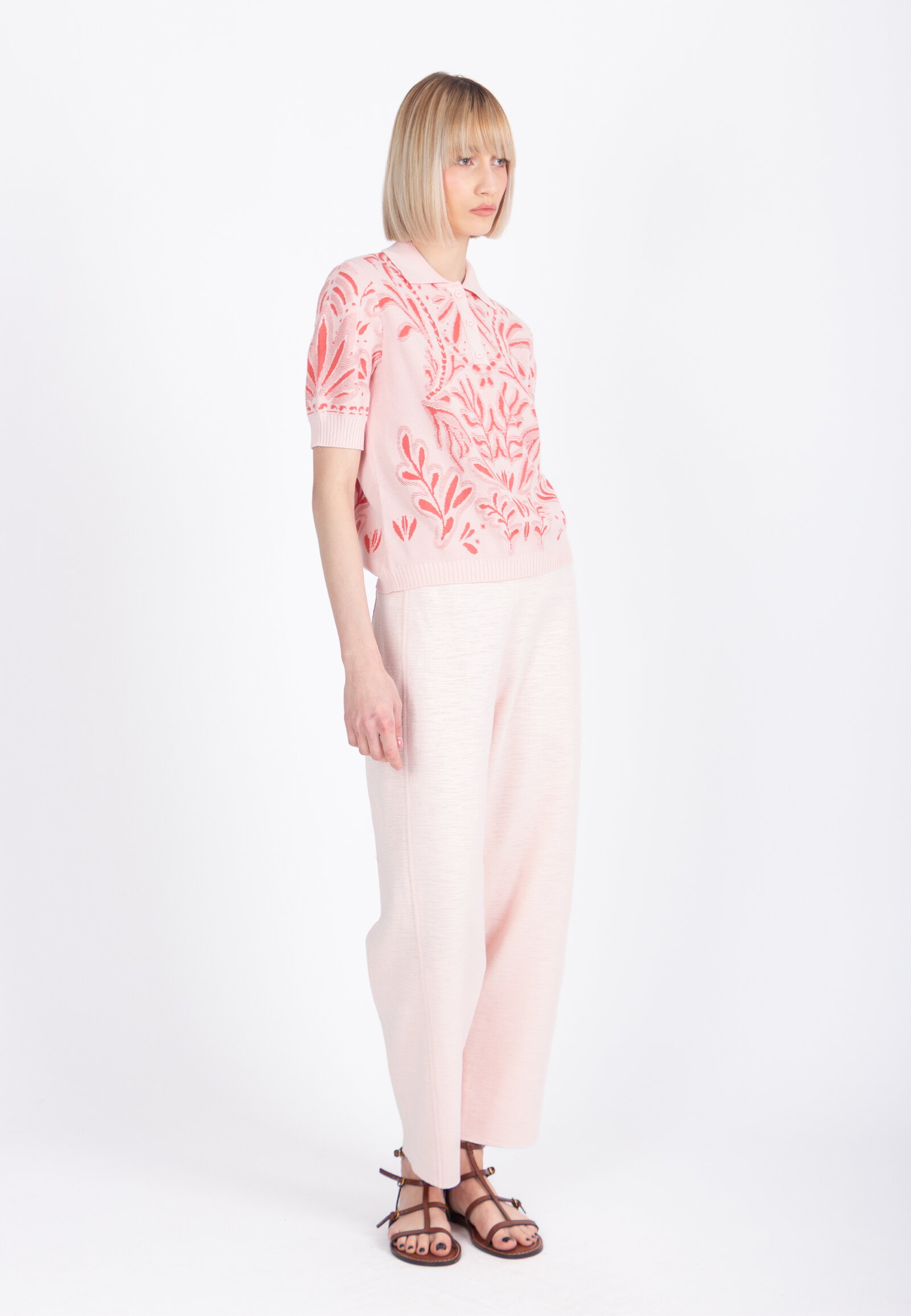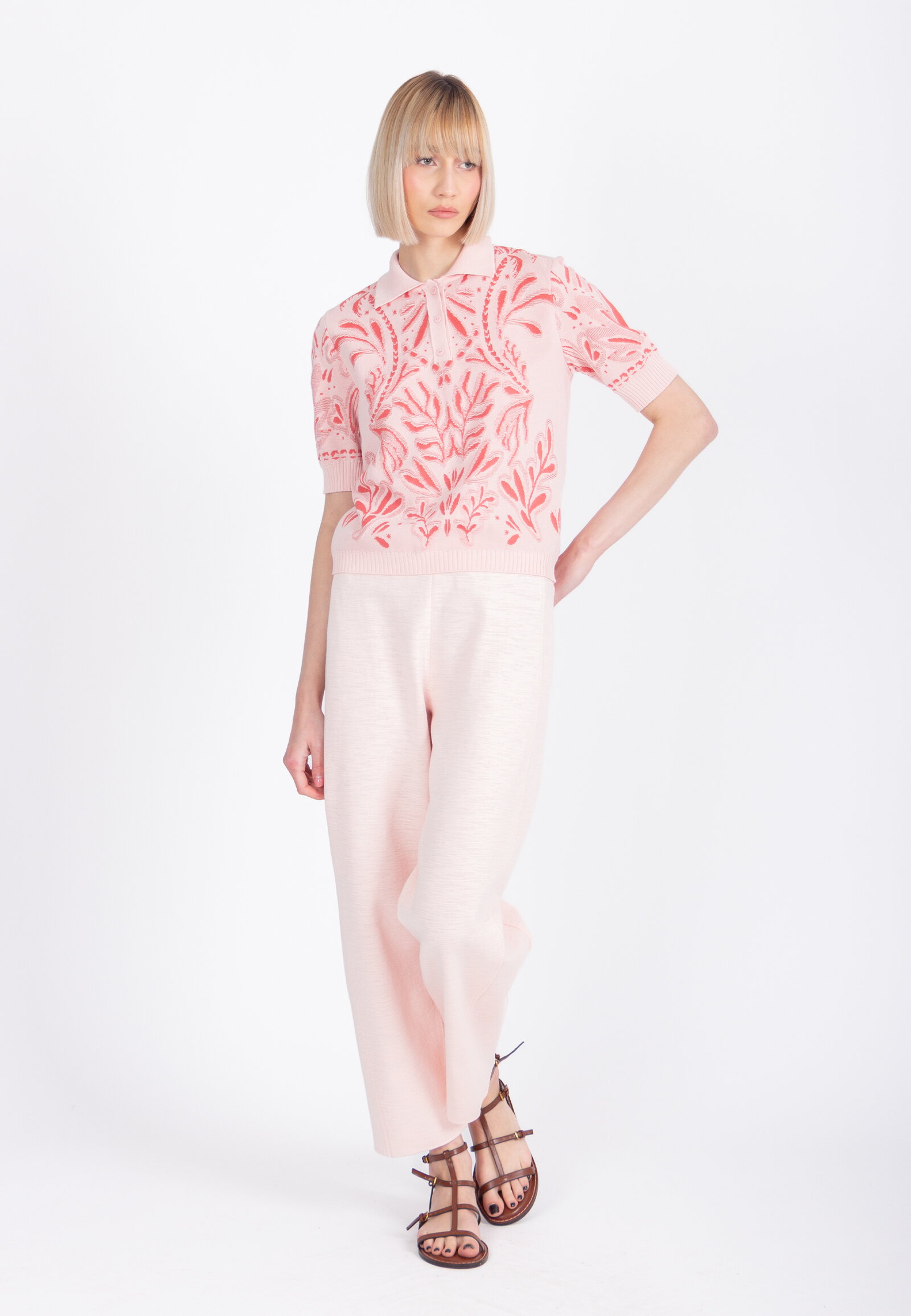 A short-sleeve jacquard pullover knitted from a cotton-viscose blend by IVKO Woman, with a dense tropical pattern. The rich botanic design brings depth to a relaxed polo-collar silhouette. Soft and naturally breathable.