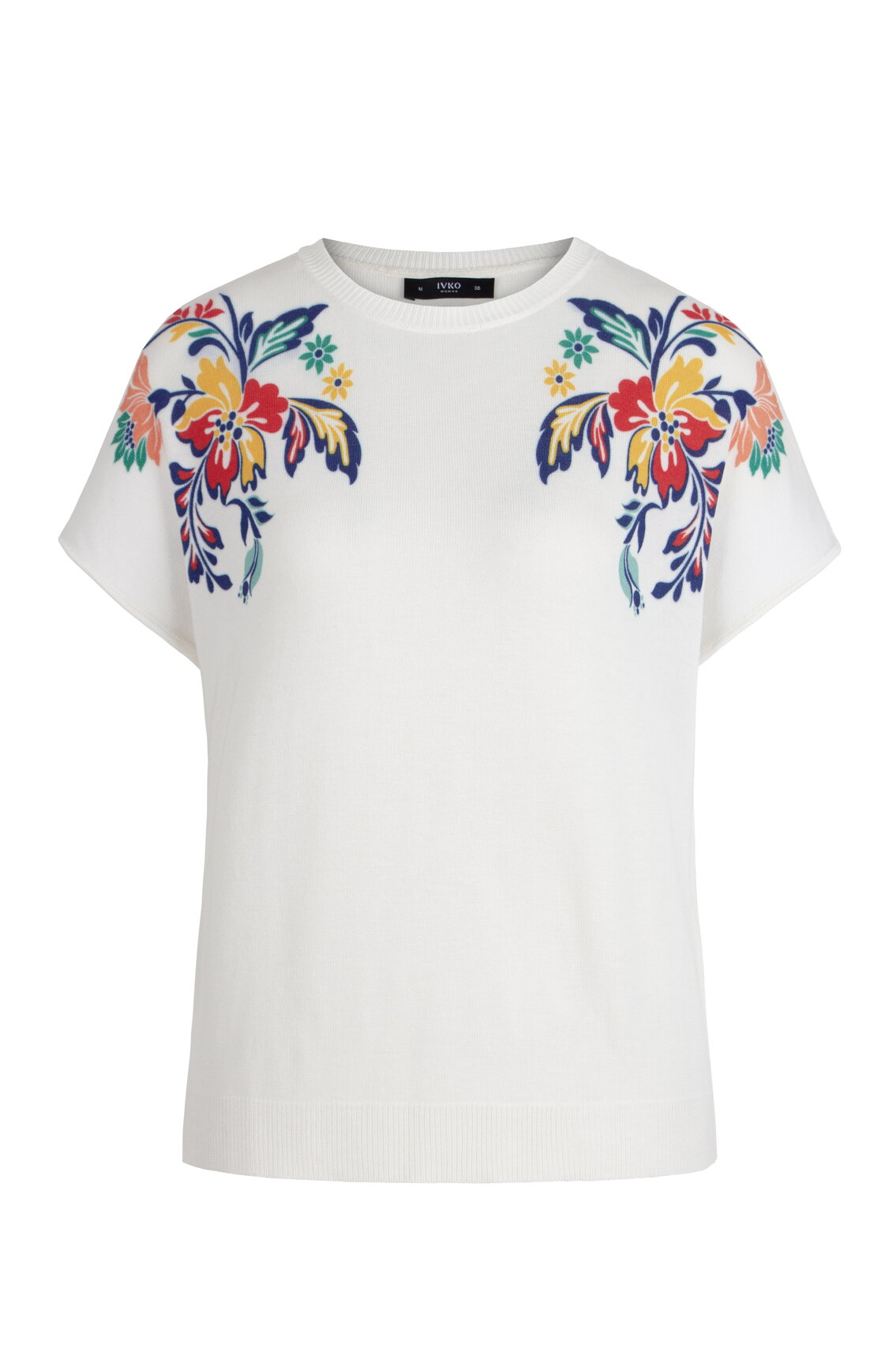 A lightweight pullover knitted from pure viscose by IVKO Woman, with a printed floral accent on the shoulders. Subtle placement brings artistic detail to a clean shape. Viscose offers natural drape and all-day softness.