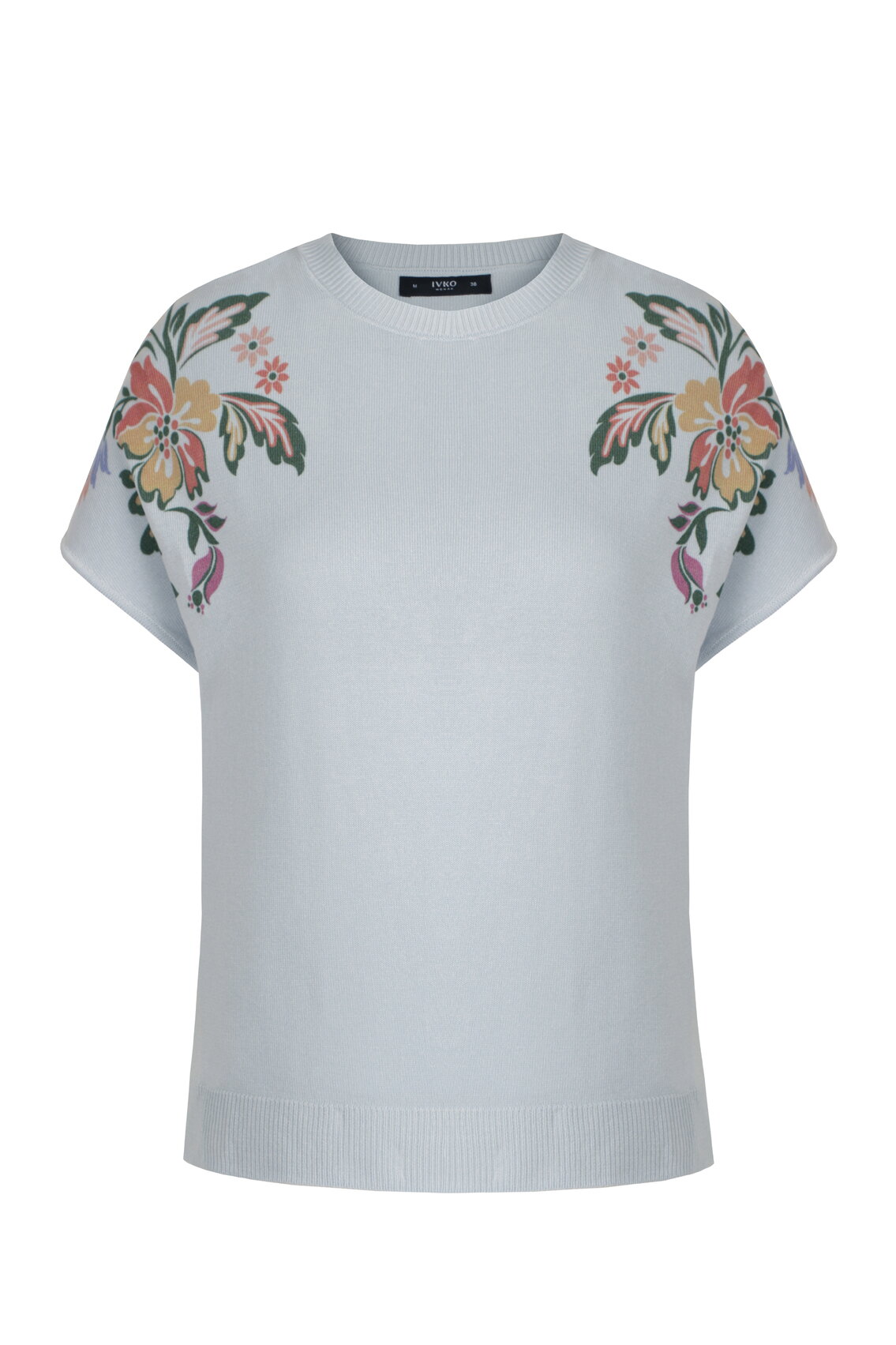 A lightweight pullover knitted from pure viscose by IVKO Woman, with a printed floral accent on the shoulders. Subtle placement brings artistic detail to a clean shape. Viscose offers natural drape and all-day softness.