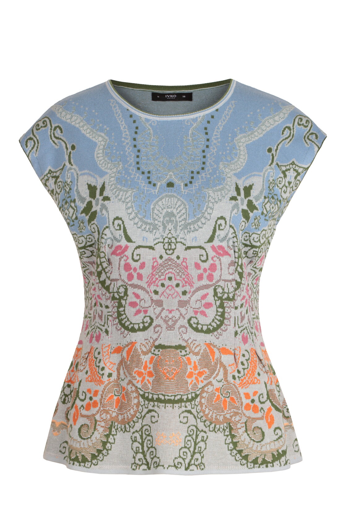 A cap-sleeve pullover knitted from a cotton-viscose blend by IVKO Woman, with a richly layered ornament pattern. Heritage-inspired design rooted in decorative ceramics. Cotton-viscose provides smooth, breathable comfort.