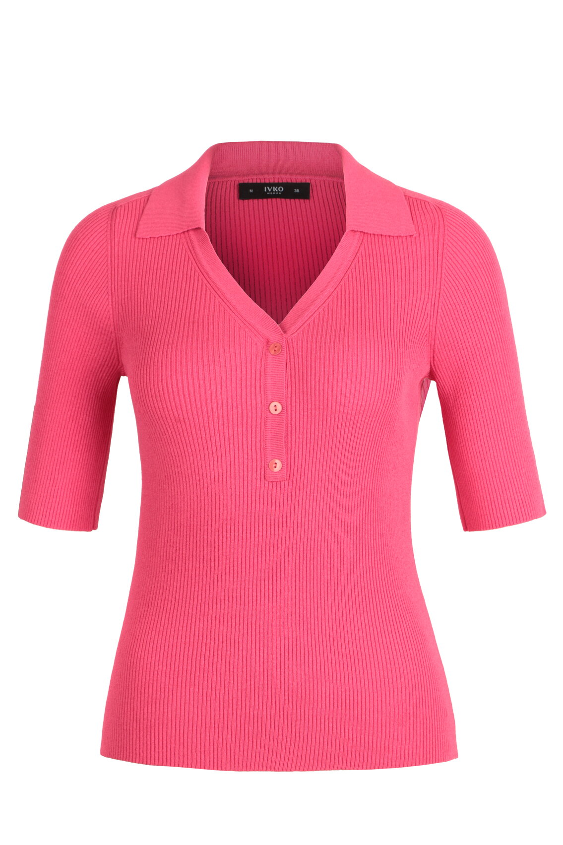 A short-sleeve pullover knitted from a viscose-polyester blend by IVKO Woman, with a distinctive collar and moiré-like ribbed texture. Subtle wave pattern adds visual intrigue to a sleek silhouette. Refined drape, lasting shape.