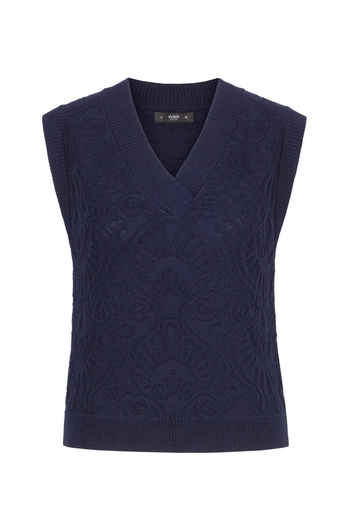 A sleeveless V-neck pullover knitted from pure cotton by IVKO Woman in an elegant brocade-like structure. The raised technique creates a rich, tactile surface within a single tone. Cotton softness and breathability for summer.