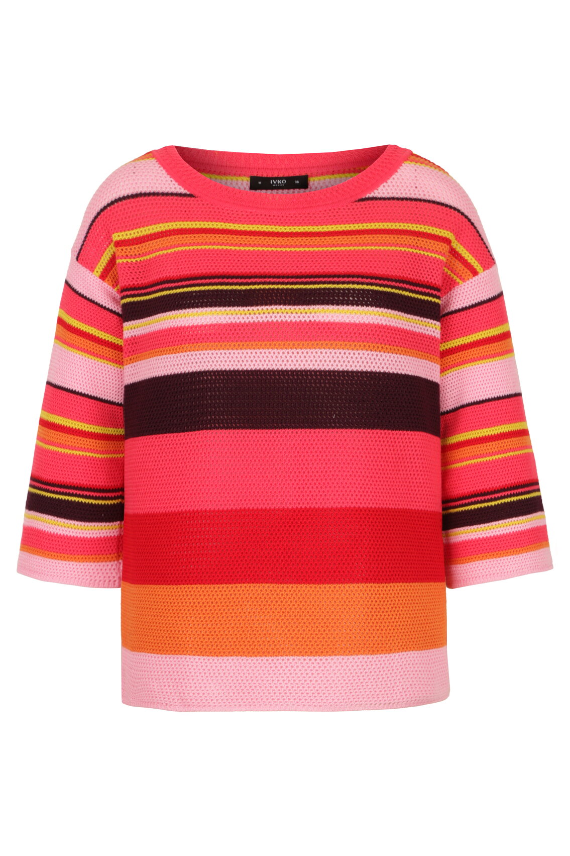 A pullover knitted from pure cotton by IVKO Woman, combining multicoloured stripes with an openwork ajour structure. Colour and texture interplay creates a light, dimensional piece. Ajour openwork enhances natural airflow.