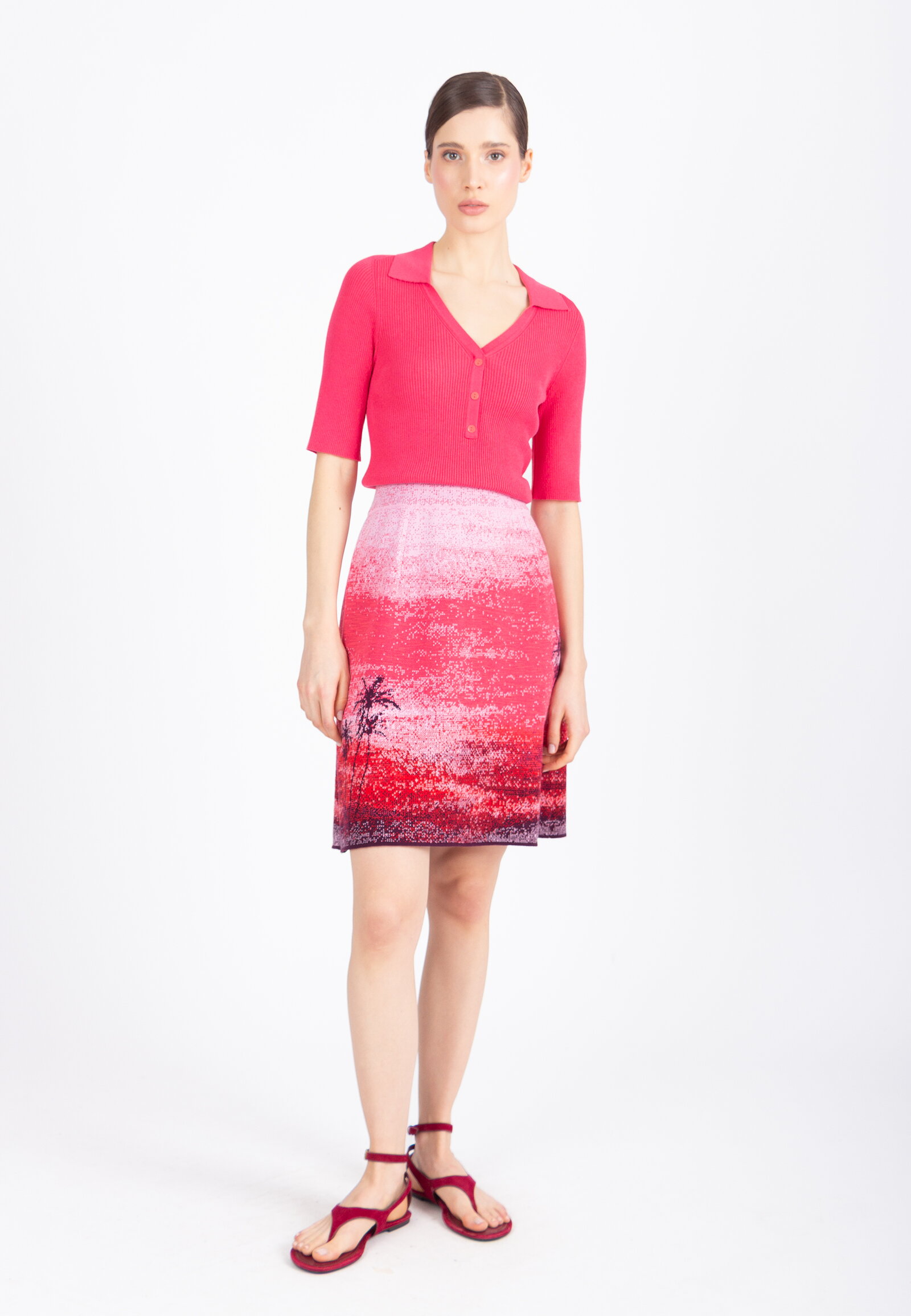 A jacquard skirt knitted from cotton by IVKO Woman, with a gradient sunset pattern and palm silhouettes. The coastal-inspired design pairs beautifully with solid knitwear tops. Durable construction for lasting shape.