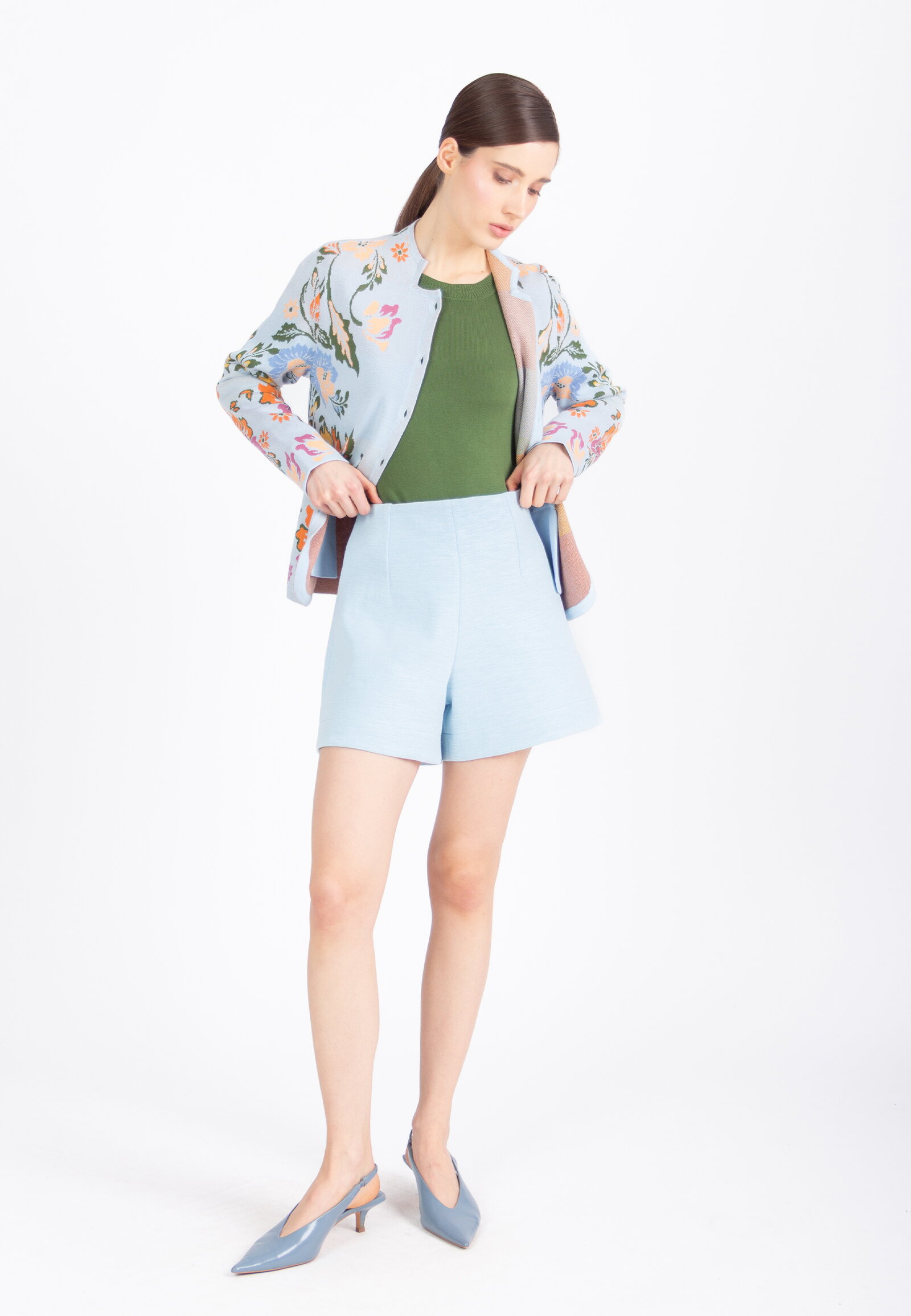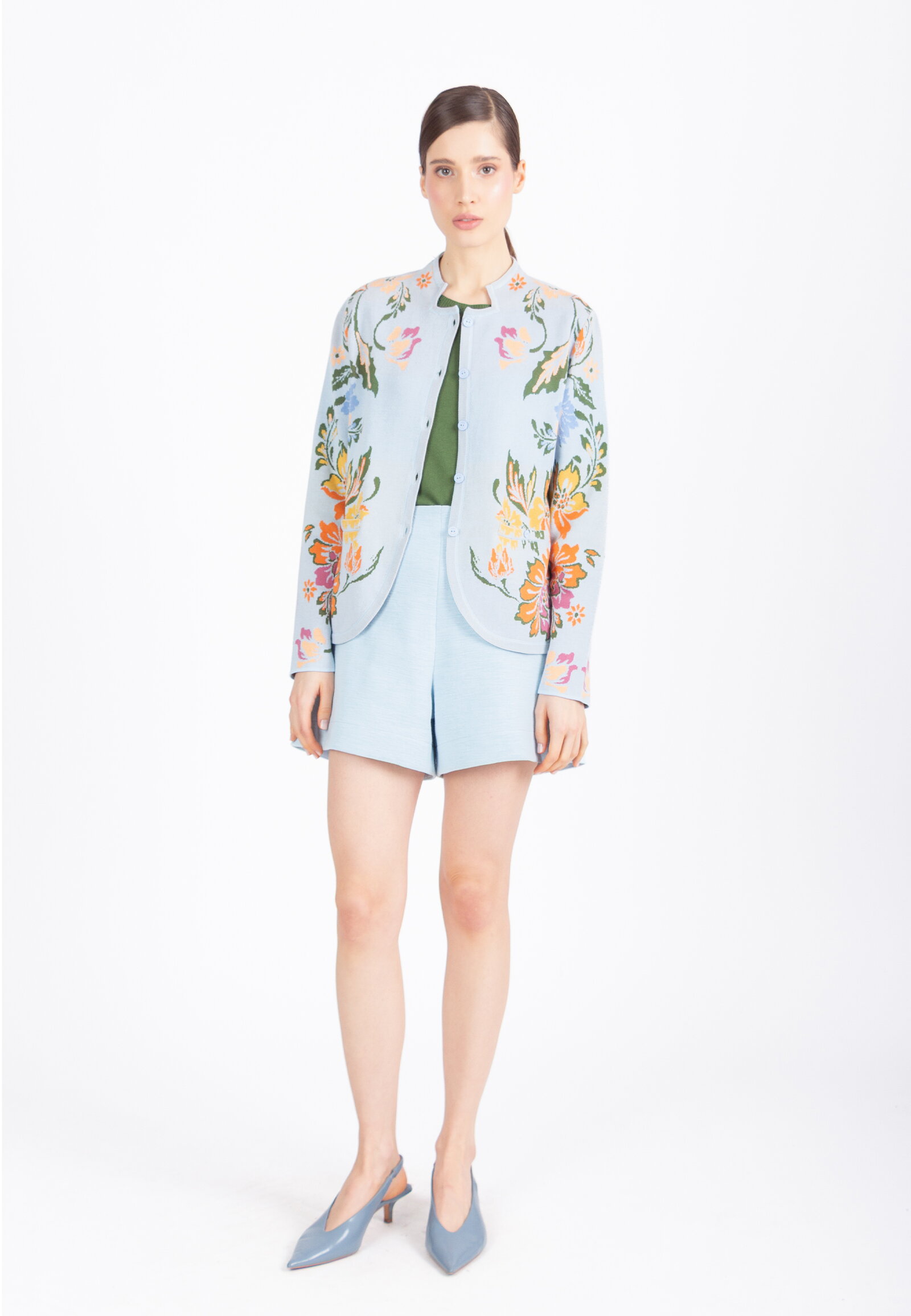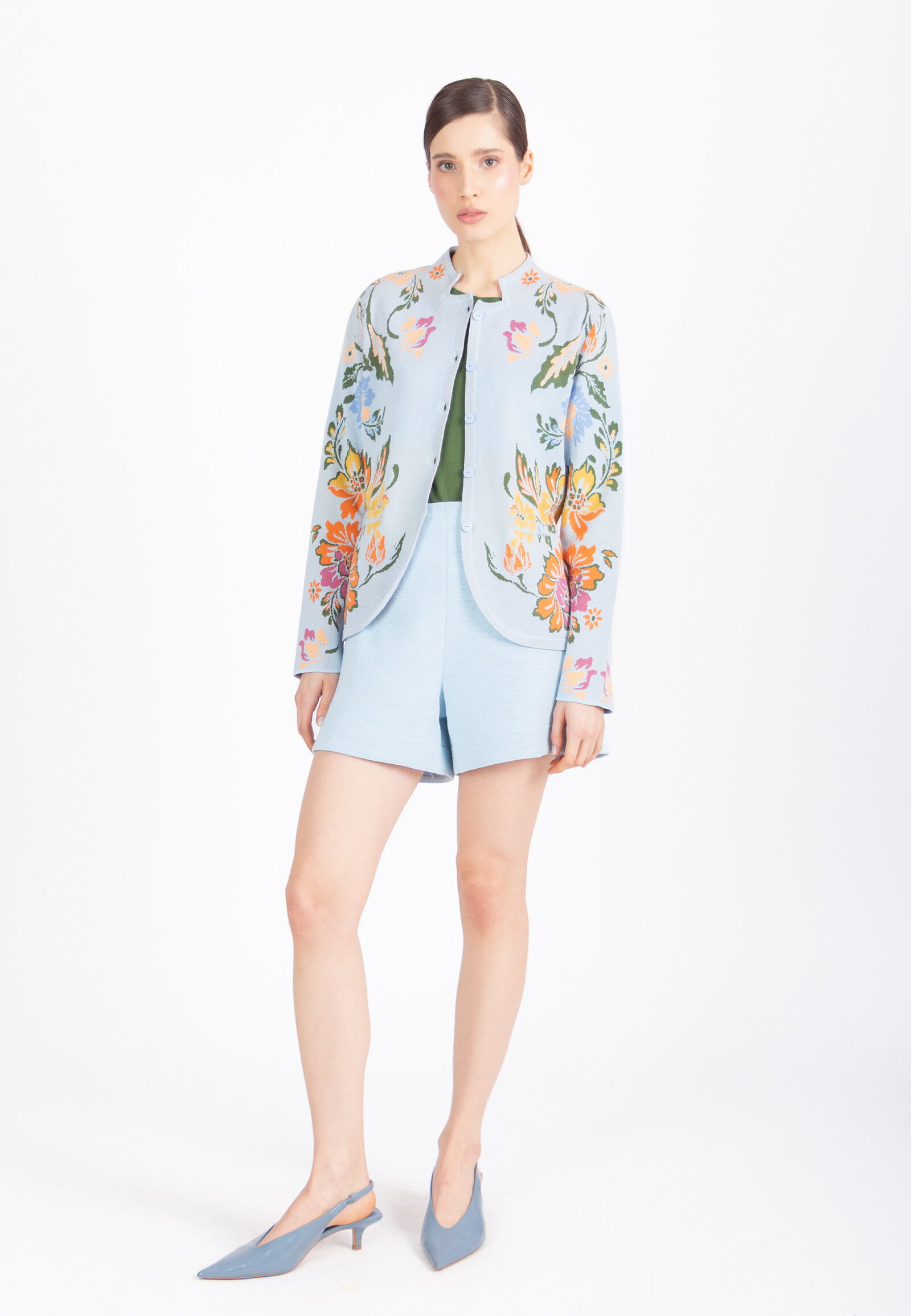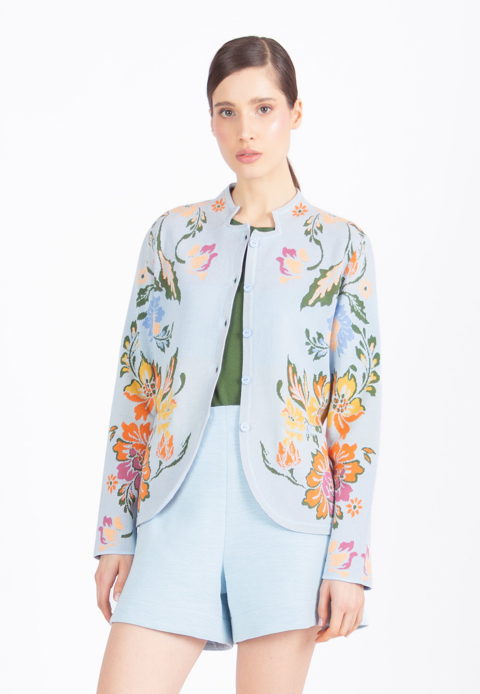 Eine Jacke mit Knopfleiste aus einem Baumwoll-Viskose-Mix von IVKO Woman, mit reich detailliertem Floralmuster. Der strukturierte Schnitt und die botanischen Motive schaffen ein elegantes Statement. Viskose bringt sanften Glanz und Fall.