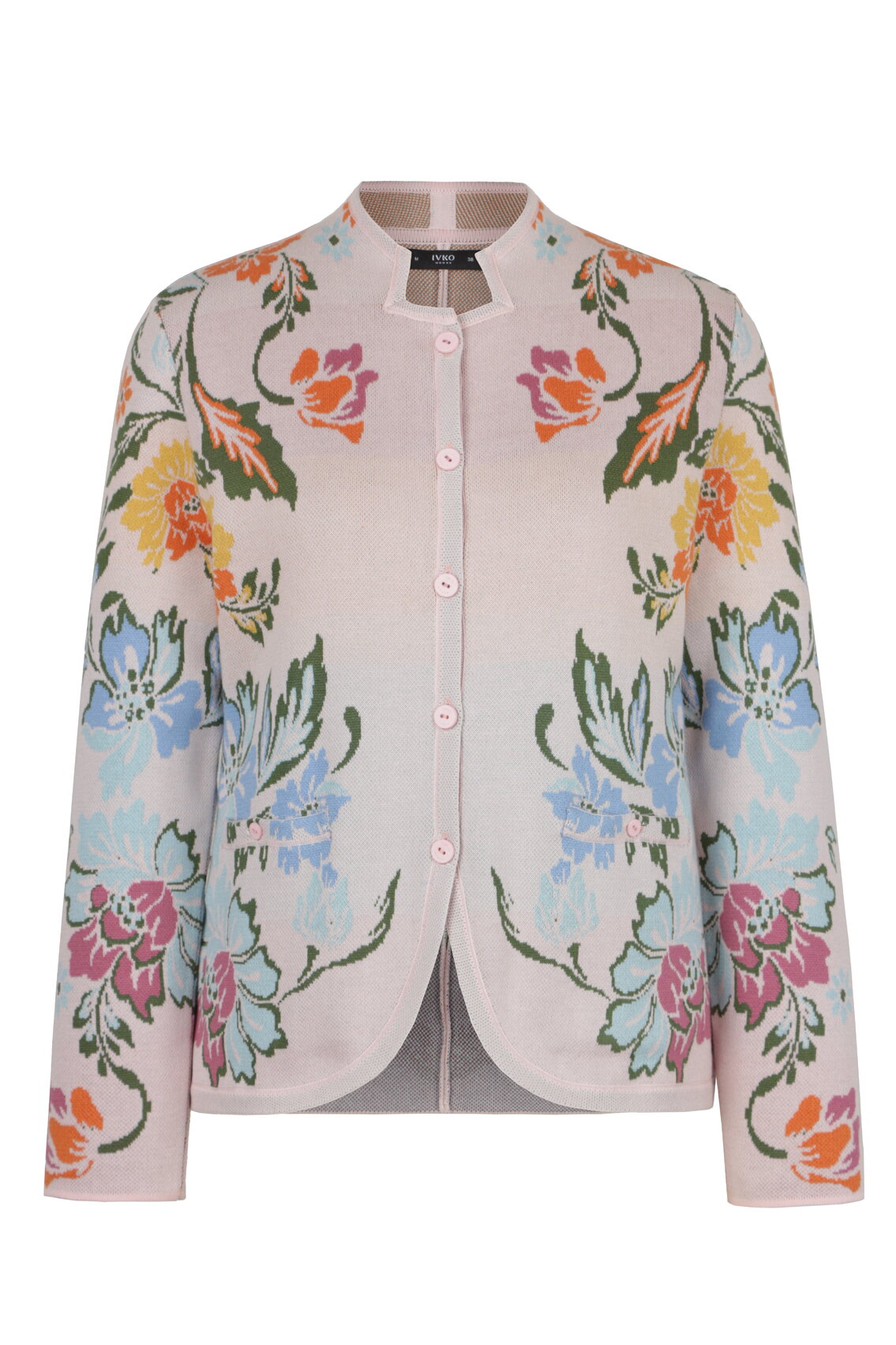 Eine Jacke mit Knopfleiste aus einem Baumwoll-Viskose-Mix von IVKO Woman, mit reich detailliertem Floralmuster. Der strukturierte Schnitt und die botanischen Motive schaffen ein elegantes Statement. Viskose bringt sanften Glanz und Fall.