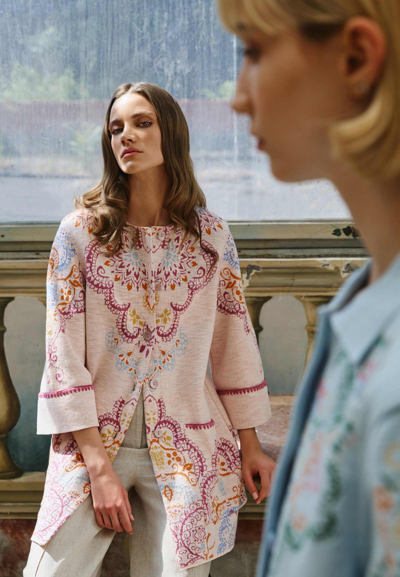 Žakard IVKO Woman kardigan sa Ornament motivom ispleten od pamuka ističe bogato razrađene ornamentalne forme inspirisane tradicionalnim zanatima. Poseduje okrugli izrez, dugmad duž prednje strane i dugačke rukave.