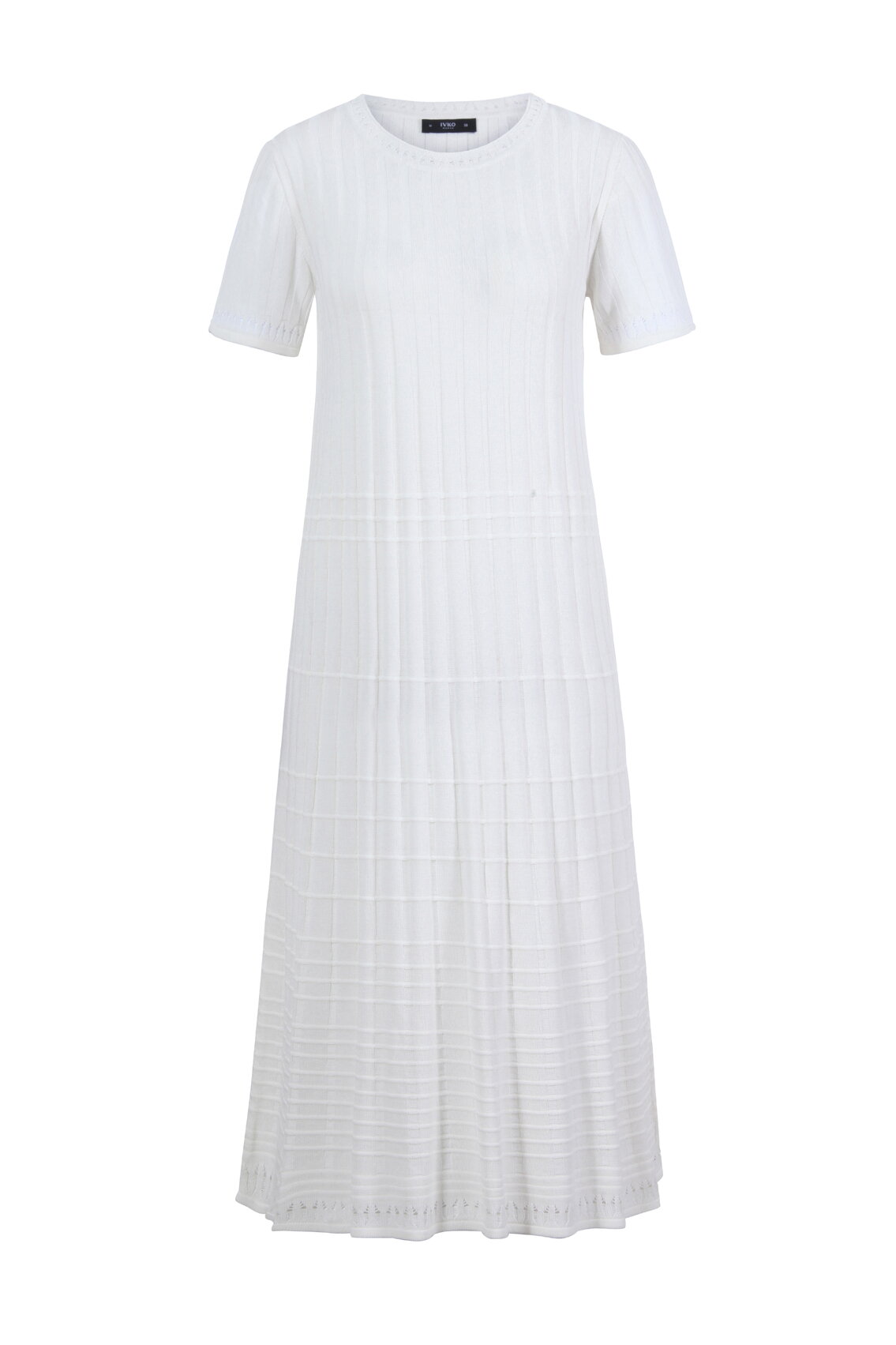 IVKO Woman haljina sa okruglim izrezom ispletena od viskoze naglašava rebrastu strukturu u čistom tonu. Ima midi dužinu i siluetu koja ostaje uredna i stabilna u pokretu.
