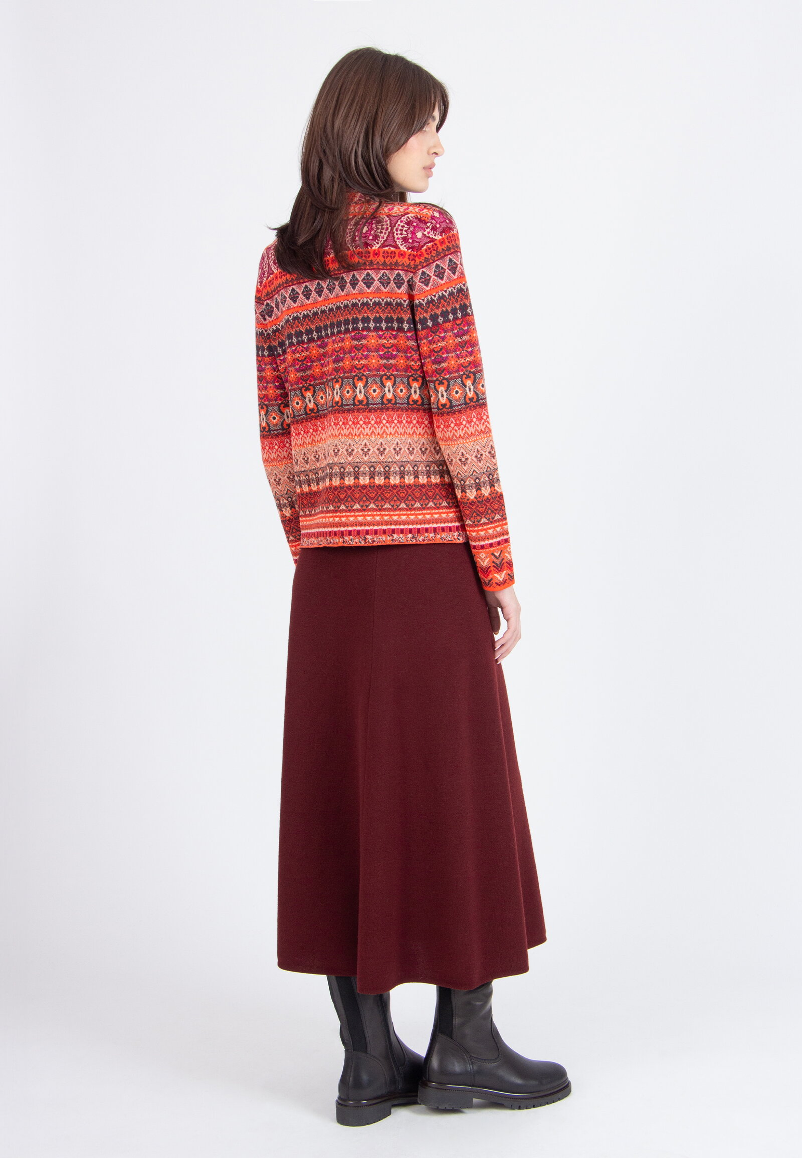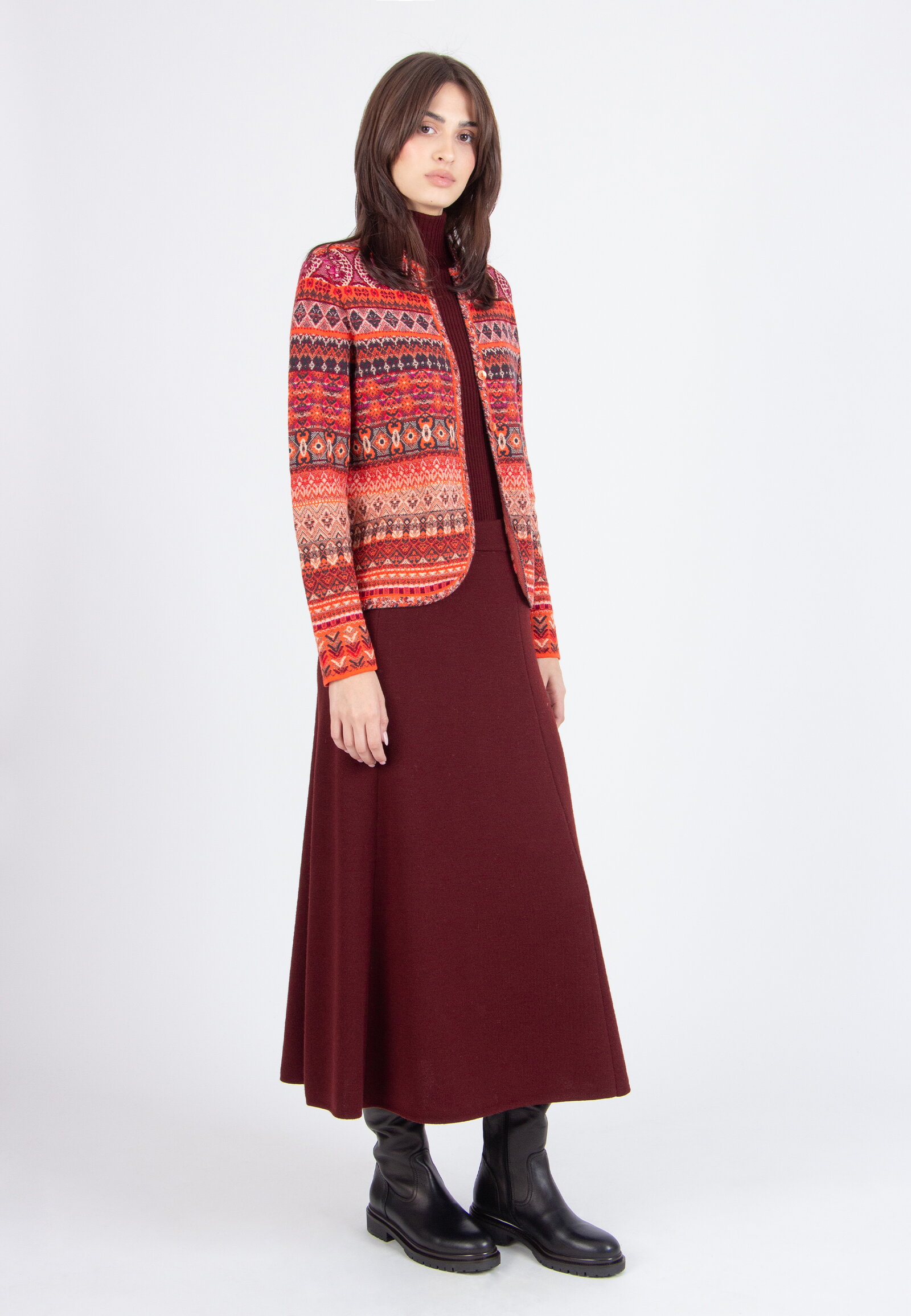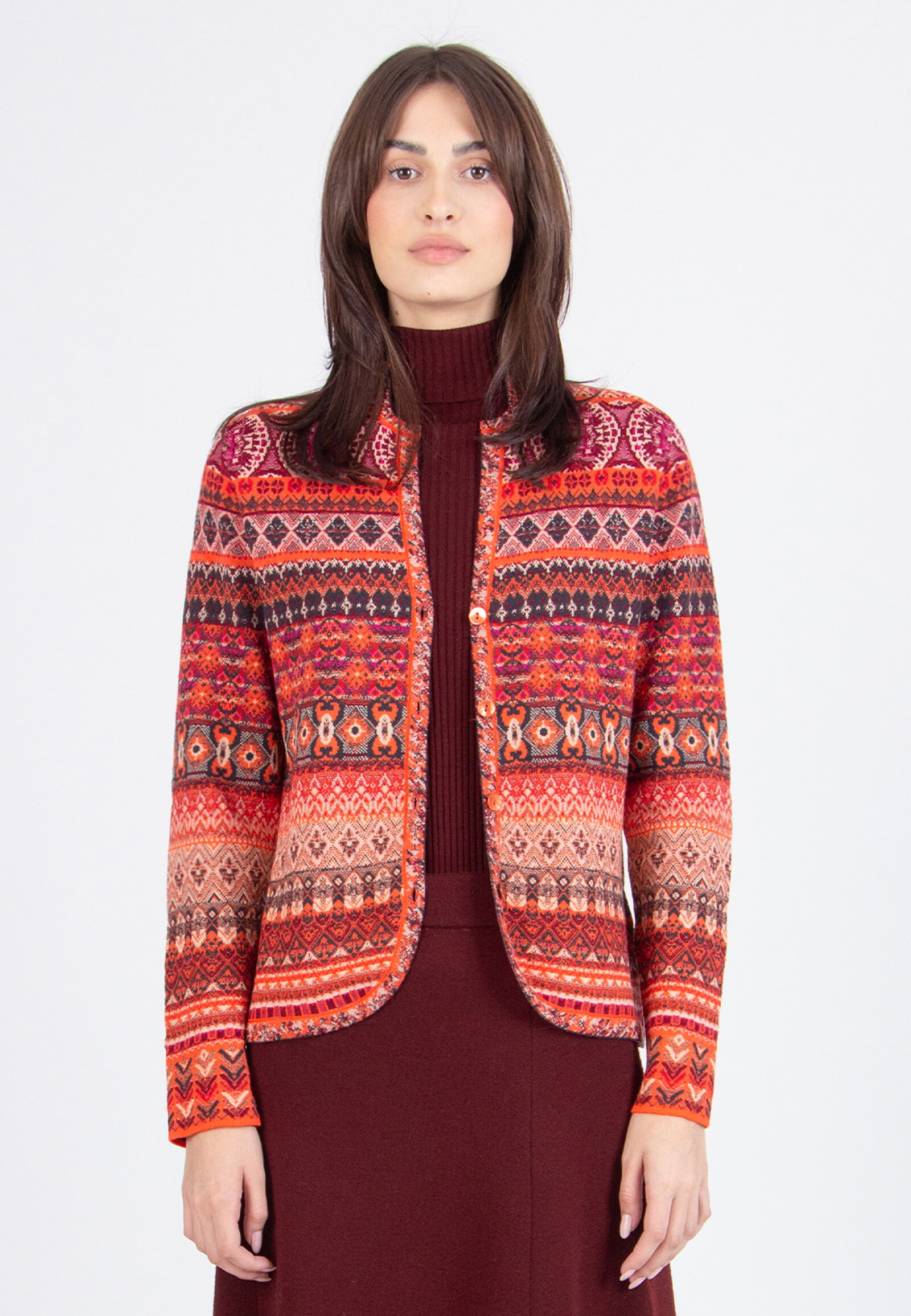 Jakna od vune sa Re-Dandy motivom izraženim kroz izražajno pletivo u više slojeva. Okrugli izrez i uredno obrađene ivice oblikuju jasan vizuelni identitet. Artikal je idealan za sofisticirane, ali opuštene zimske kombinacije.